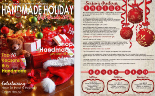 Limited space is now available in IBN’s 2012 Handmade Holiday Gift Guide! As you can see from the cover, this is one eye-catching, festive piece of media, and we plan to put it in the hands of as many thousands of potential buyers as we can between October 15 and the end of the holiday…